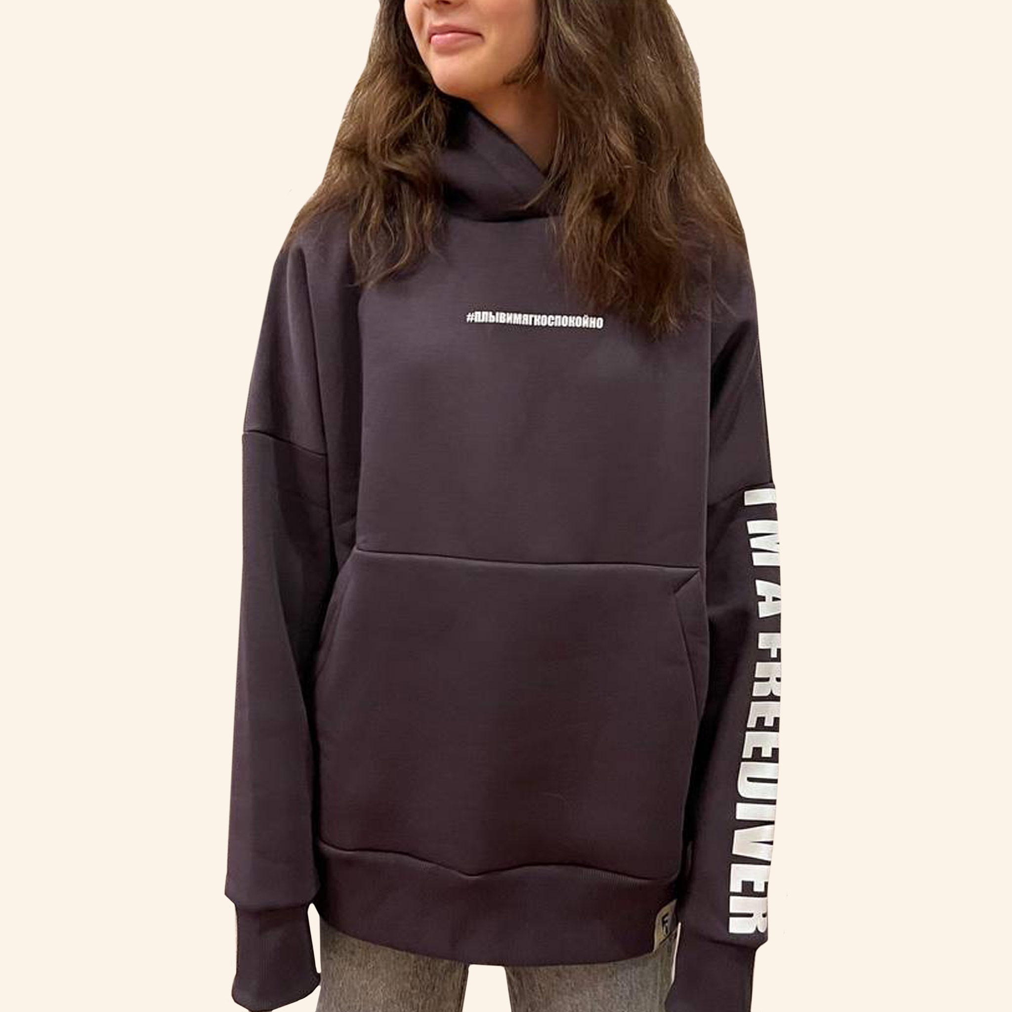 На рукаве гордо красуется надпись «I’M A FREEDIVER», а на передней части графитового худи — вдохновляющая фраза «#плывимягкоспокойно».